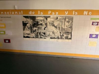 Con motivo del Día Escolar de la Paz y la No Violencia (30 de enero), el alumnado de 2.º ESO de la materia de Valores Éticos llevó a cabo una intervención artística y reflexiva que aunó educación en valores y expresión plástica. Guiados por el profesorado de Dibujo, los estudiantes trasladaron al muro del pasillo central una reproducción colaborativa del Guernica de Picasso, respetando el blanco y negro original para acentuar su carga simbólica. Junto al mural, el grupo bilingüe elaboró y rotuló preguntas detonadoras —en español e inglés— sobre la guerra, el sufrimiento civil y la responsabilidad individual en la construcción de la paz, fomentando así el debate tanto en las clases de Valores Éticos como en los recreos. La actividad concluyó con una visita guiada, preparada por el propio alumnado, en la que se invitó a los demás cursos a contemplar la obra y responder a las cuestiones planteadas, convirtiendo el espacio común del instituto en un punto permanente de reflexión sobre la paz.